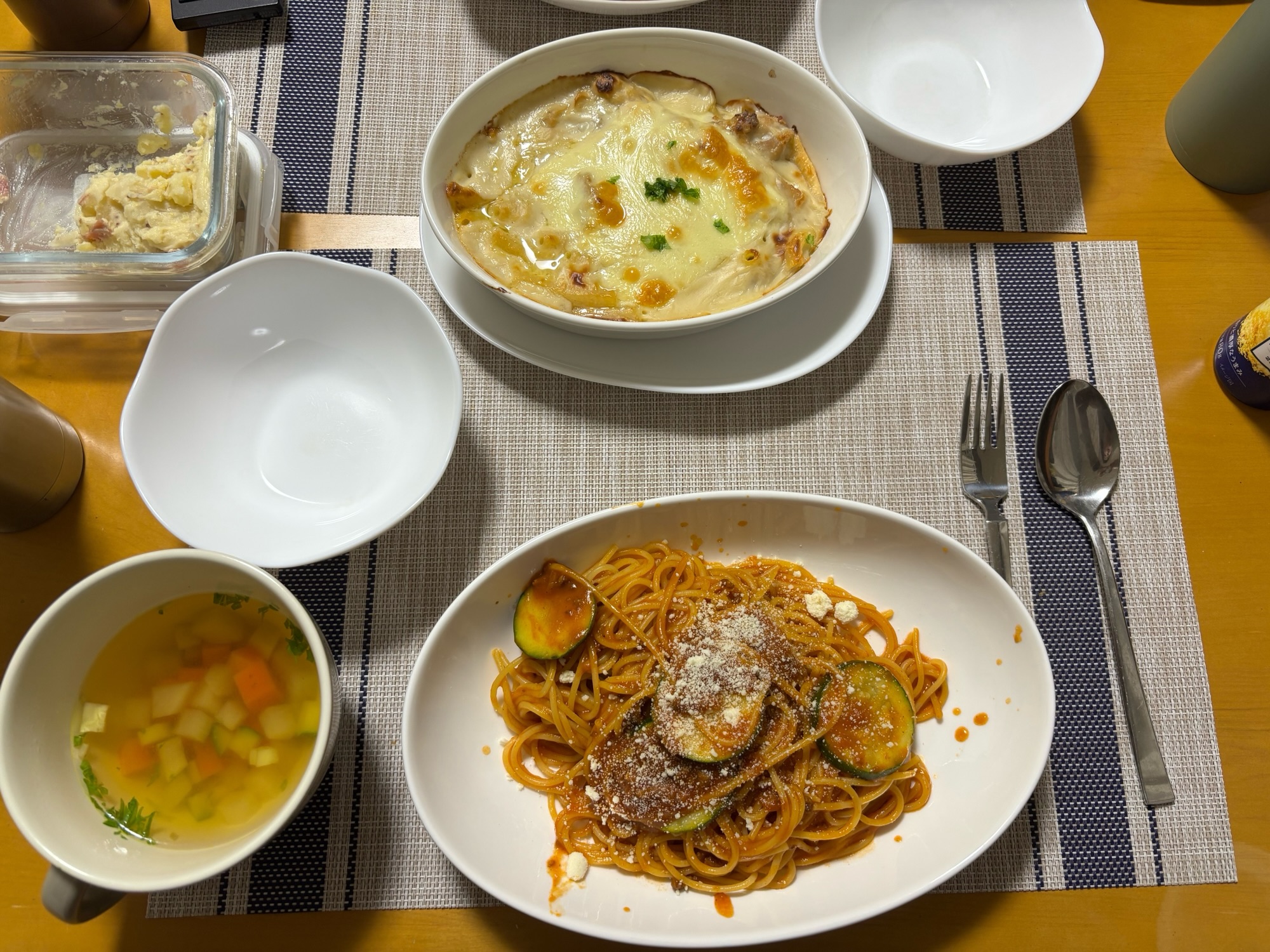 この日は前日のグラタンの残りとコンソメスープをつけました。