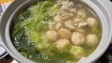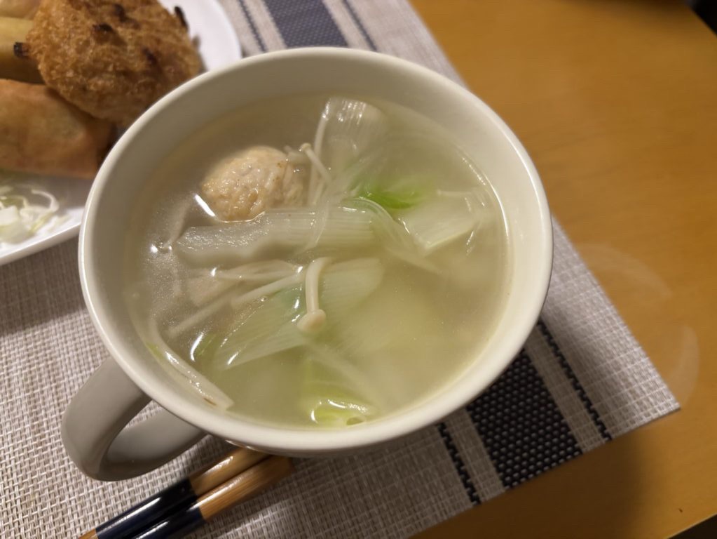 白菜、ネギ、えのきと鍋の具材の残りの鳥つくねで鍋風の汁物に。